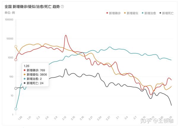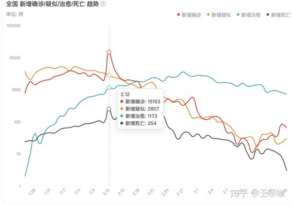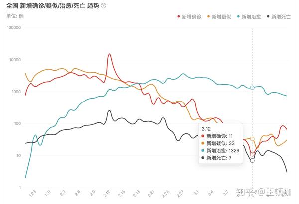 在3月12日呈最低状态,从峰值到低谷耗时接近1个月,总体1月26号到目前疫情平稳控制耗时两个月时间(包括人为干预)