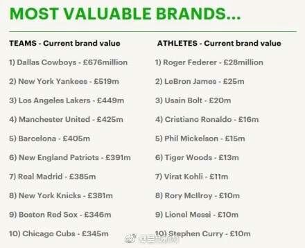同时,费德勒的个人品牌价值在所有运动员中排名第一